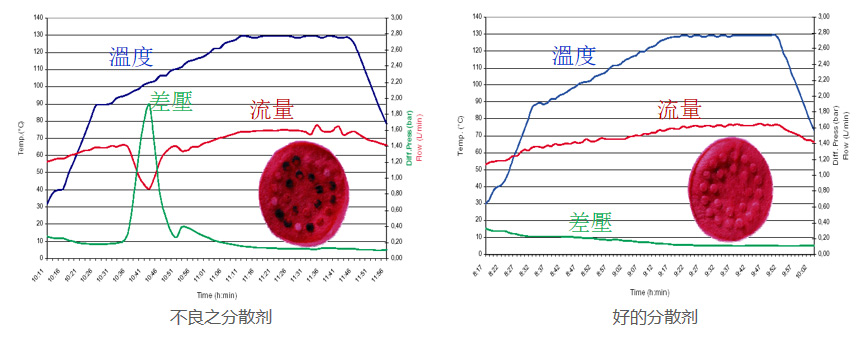 染料分散安定性在整個(gè)溫度區(qū)間不是一致安定。一般而言,分散染料在95~120℃之間時(shí)容易凝集變大,因而造成液流壓力增加及液流通過(guò)量減少,在120℃以上時(shí)這種現(xiàn)象又開始減少。
