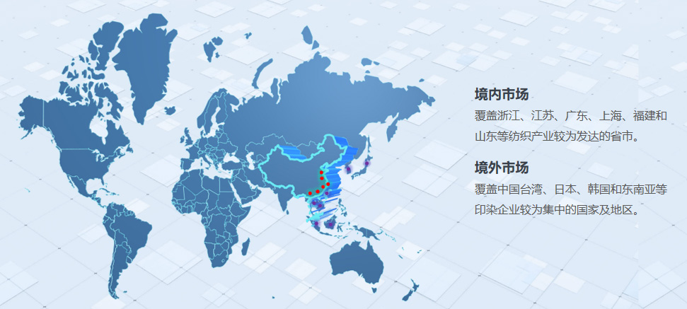 經(jīng)過多年的發(fā)展,公司已構(gòu)建覆蓋境內(nèi)外重點(diǎn)市場的營銷網(wǎng)絡(luò)。在境內(nèi)市場,公司客戶已覆蓋至浙江、江蘇、廣東、上海、福建和山東等紡織產(chǎn)業(yè)較為發(fā)達(dá)的省市;在境外市場,公司客戶覆蓋中國臺灣、日本、韓國和東南亞等印染企業(yè)較為集中的國家及地區(qū)。