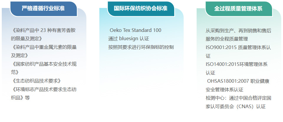 公司嚴(yán)格按照《染料產(chǎn)品中 23 種有害芳香胺的限量及測(cè)定》、《染料產(chǎn)品中重金屬元素的限量及測(cè)定》、《國(guó)家紡織產(chǎn)品基本安全技術(shù)規(guī)范》、《生態(tài)紡織品技術(shù)要求》、《環(huán)境標(biāo)志產(chǎn)品技術(shù)要求生態(tài)紡織品》等標(biāo)準(zhǔn)中涉及染料方面的質(zhì)量要求,進(jìn)行產(chǎn)品質(zhì)量控制。