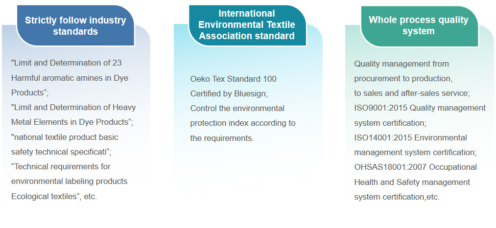 Our company strictly follows the "Limits and Determination of 23 Harmful Aromatic Amines in Dye Products", "Limits and Determination of Heavy Metal Elements in Dye Products", "National Basic Safety Technical Specifications for Textile Products", "Technical Requirements for Ecological Textiles", "Technical Requirements for Environmental Labeling Products, Ecological Textiles" and other standards.According to the quality requirements of dyes, product quality control shall be carried out.